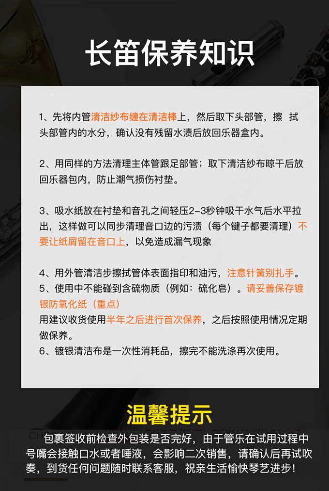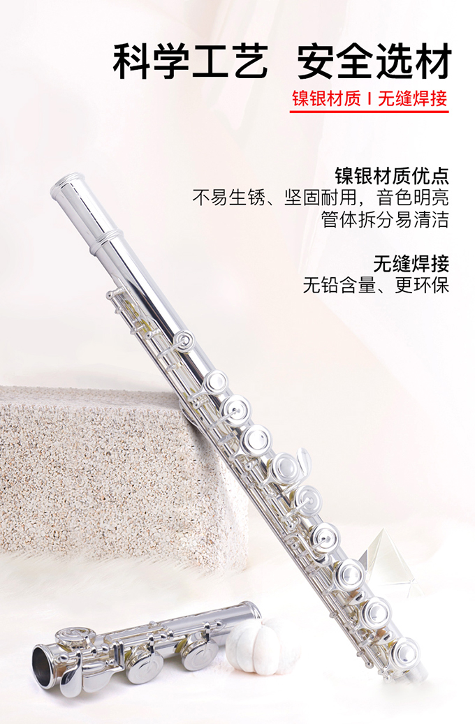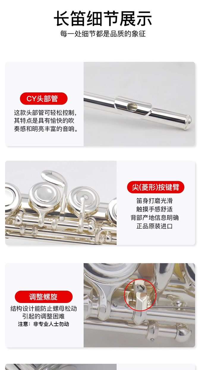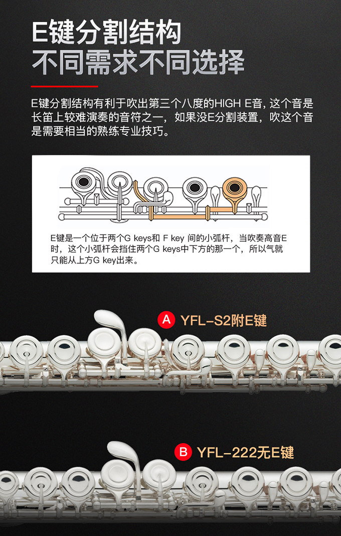 为了让长笛演奏者体会到音乐的魅力以及演奏的乐趣,采用了雅马哈多年的制作技术以及专有技术。与型号一样的尖(菱形)按键设计,帮助初学者更好地控制按键。