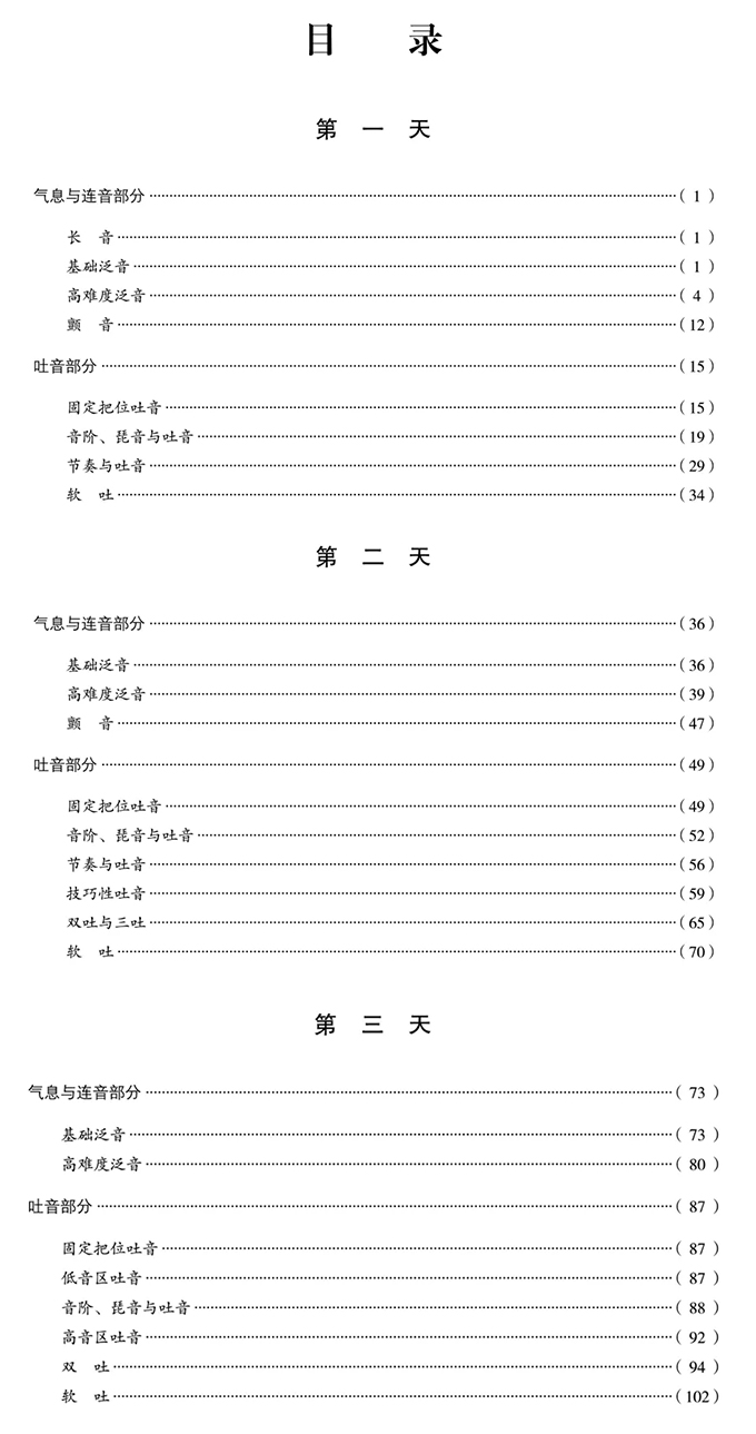 练习从气息、连音技术、吐音技巧等方面加以细化,并且整理了全套的音阶、琶音,使练习者能够从技术层面、调式变更、音乐色彩等方面得到有效训练。